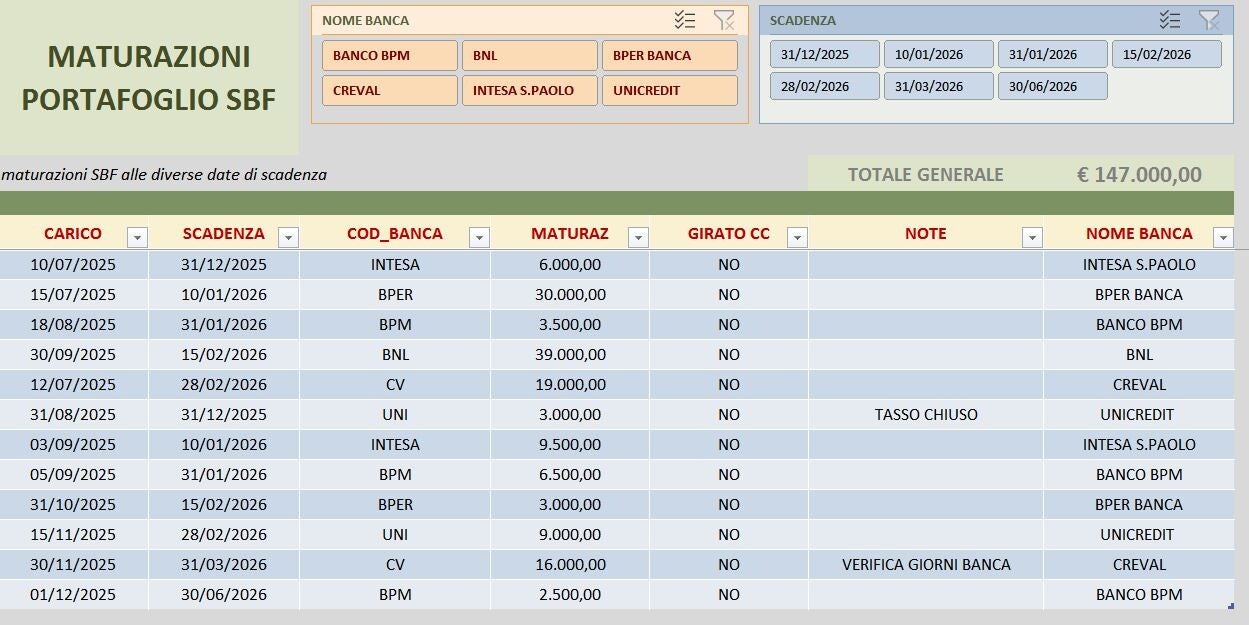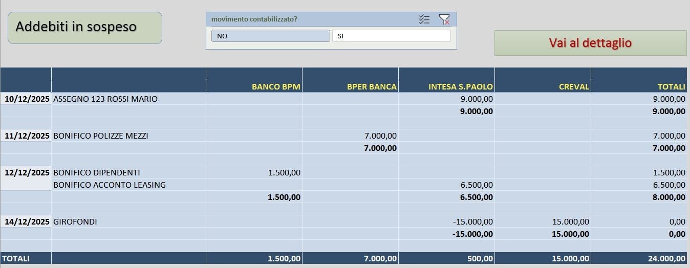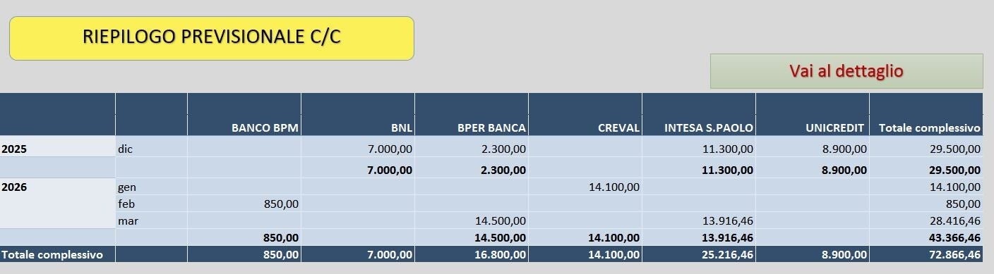 Vuoi sapere quanti soldi avrai a fine mese e oltre? Nessun problema. Abbiamo una soluzione che considera tutte le uscite sugli estratti conto, come mutui, leasing e utenze, e prevede la liquidità fino a 90 giorni, tenendo conto di limiti come affidamenti sbf, promiscui e anticipo fatture. Così potrai prendere decisioni informate e senza rischi.